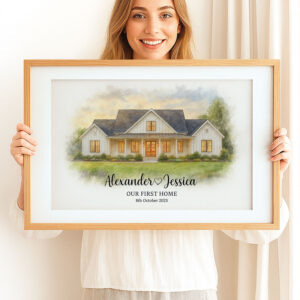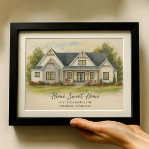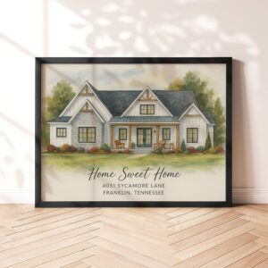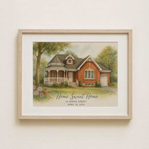 “Hand-Painted Watercolor Print of Your Dream Home – Customizable ‘Home Sweet Home’ Decor”