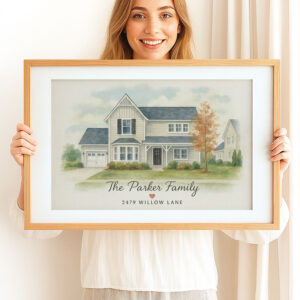 Transform your living space with our exquisite personalized watercolor house portrait. This stunning artwork features an enchanting depiction of a cozy, craftsman-style home surrounded by lush greenery, evoking warmth and nostalgia. Perfect for celebrating family heritage or as a thoughtful gift!