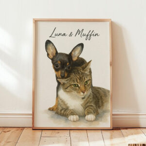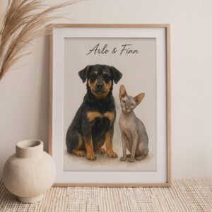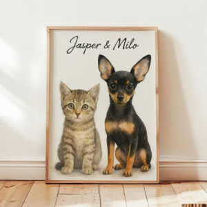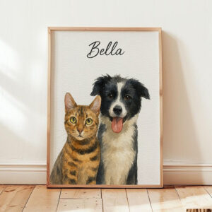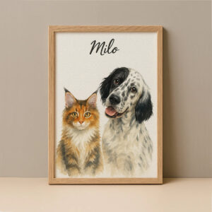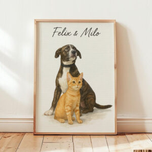 “Personalized Watercolor Pet Portrait of Max the Dog and Oliver the Cat – Perfect for Animal Lovers”