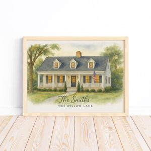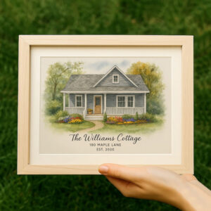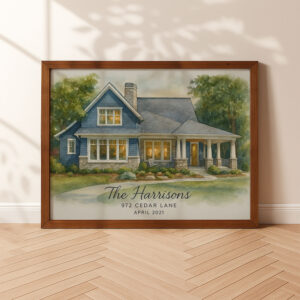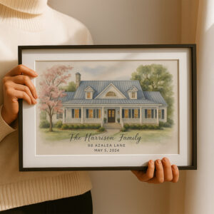 Bring warmth and charm into your home with this **Personalized Family Home Portrait**! This exquisite piece showcases your family’s residence in a stunning watercolor style, capturing the essence of your beloved home.