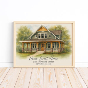 “Personalized Watercolor Home Portrait | Custom ‘Home Sweet Home’ Art Print for Your Address”