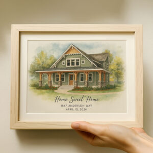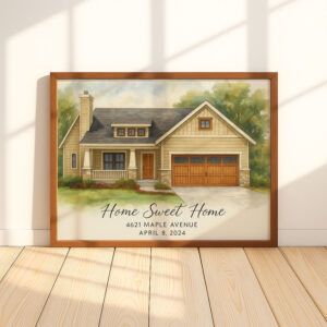 Capture the magic of your first home with our stunning watercolor-style portrait, perfect for celebrating love and new beginnings!