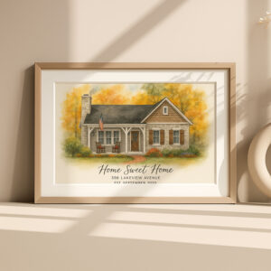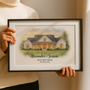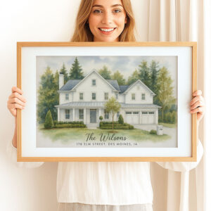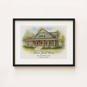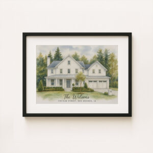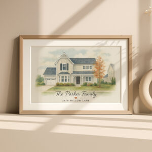 Be the first to review ““Personalized Watercolor House Portrait – The Harrison Family at 853 Riverwood Lane, Custom Art for Home Decor”” Cancel reply